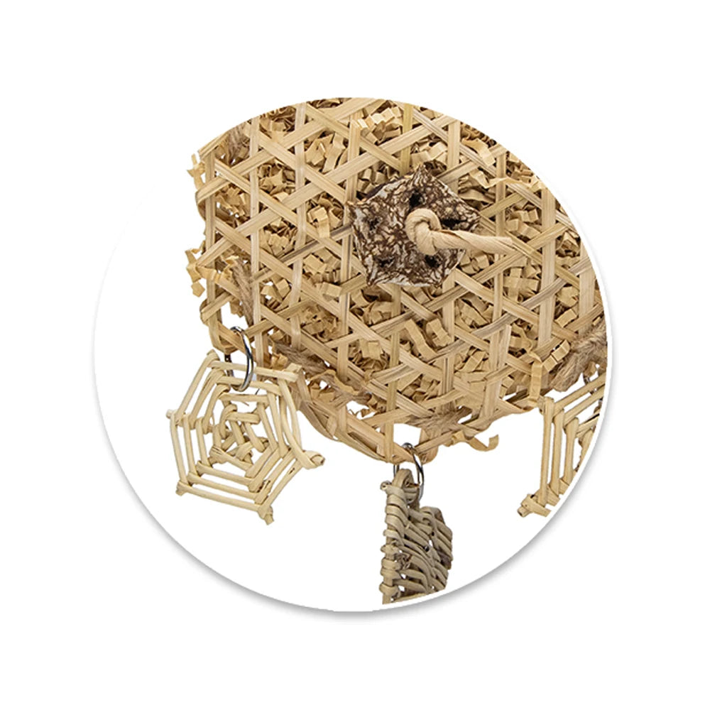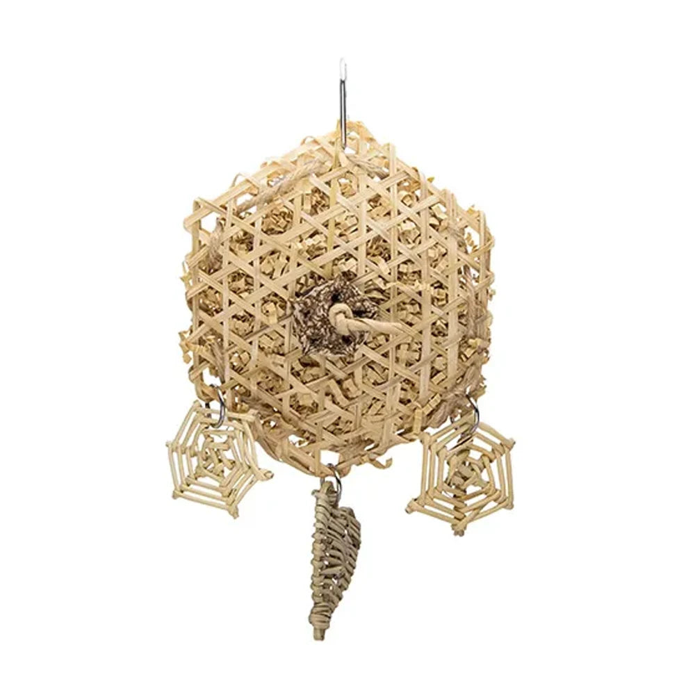 Made from a delicate combination of wicker, paper shreds, a vine ball, and a heart and web centrepiece, this toy is full of texture and intrigue. Finished with jute rope, mahogany slices, and securely suspended with paper twine, metal rings, and a steel pear link, the Bamboo Dreamcatcher is ideal for birds who love to chew, shred and explore.