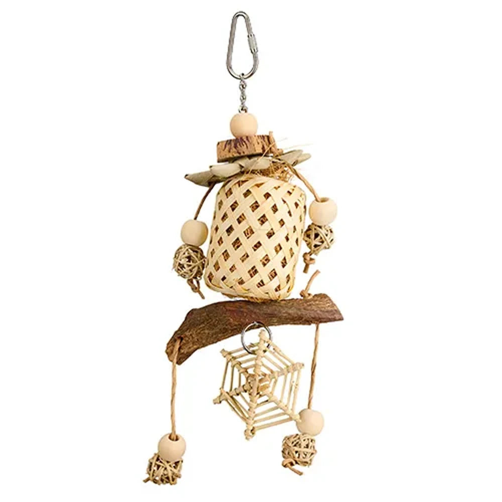 This unique bird toy features a woven web and vine balls, a charming pandan star, mahogany wood slices, wooden beads, a wood base, and coco husk shred, all tied together with paper twine and hung securely with a pear link and chain. The wicker basket shape gives birds plenty of places to nibble, perch and investigate.