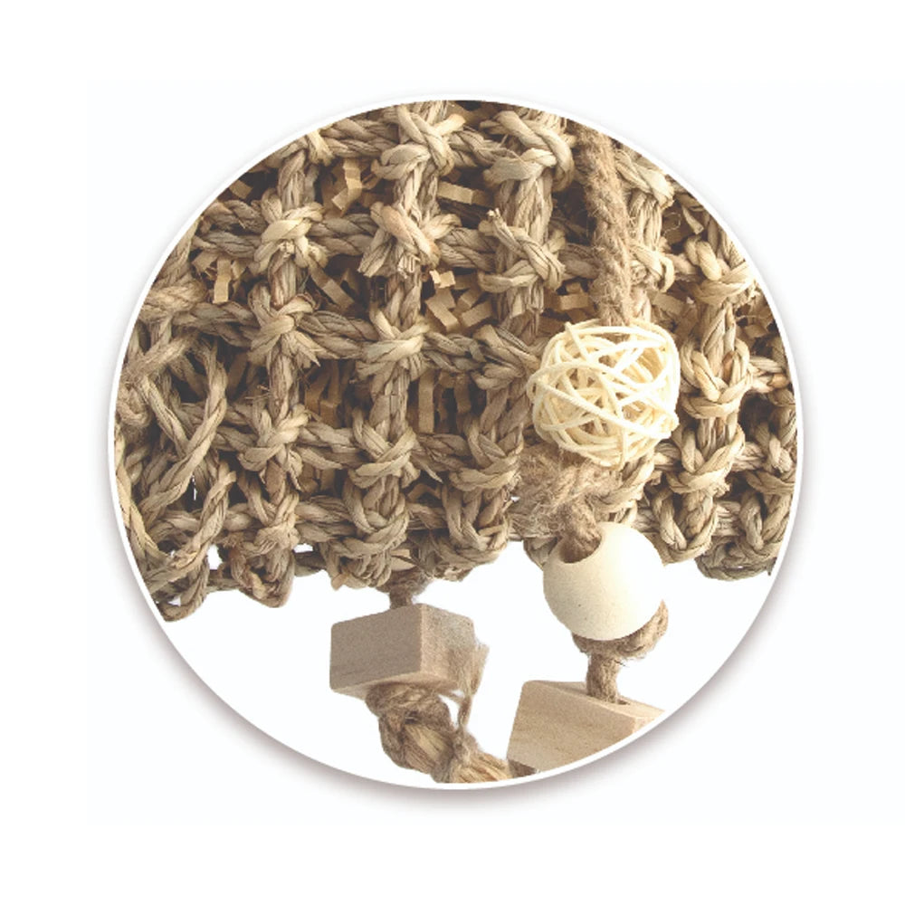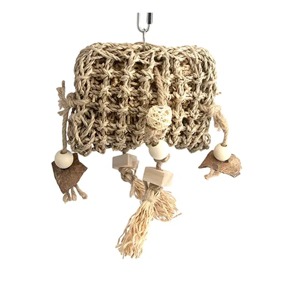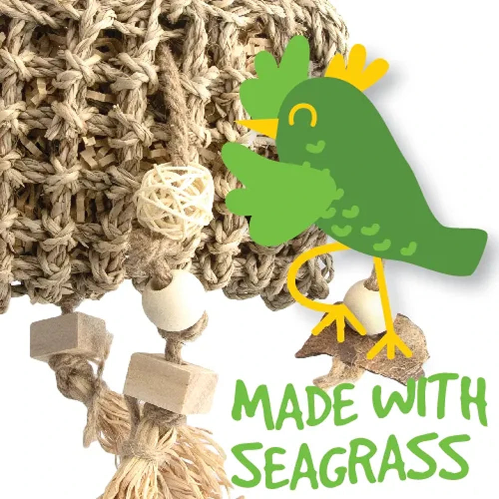 This cleverly crafted pouch is made from woven seagrass, filled with enticing paper shred, and finished with a playful raffia tassel adorned with wooden blocks and beads on jute rope. It’s perfect for hiding small treats inside to turn snack time into a foraging adventure.