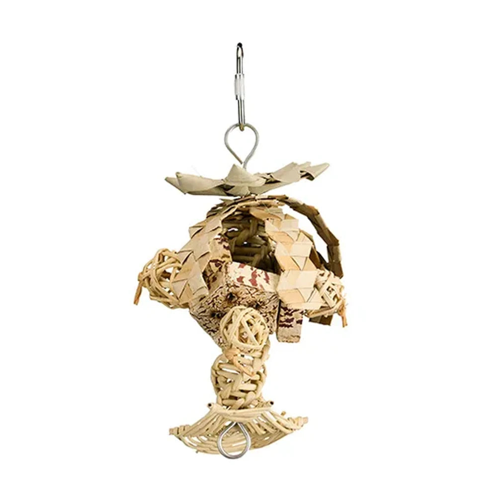 Made with vine balls and web, a sturdy vine twist, mahogany slices, a playful pandan star, and woven palm leaf, all threaded together with paper twine and securely mounted on a metal skewer with a pear link for easy cage attachment. The layered textures encourage natural play and satisfy the urge to chew and shred.