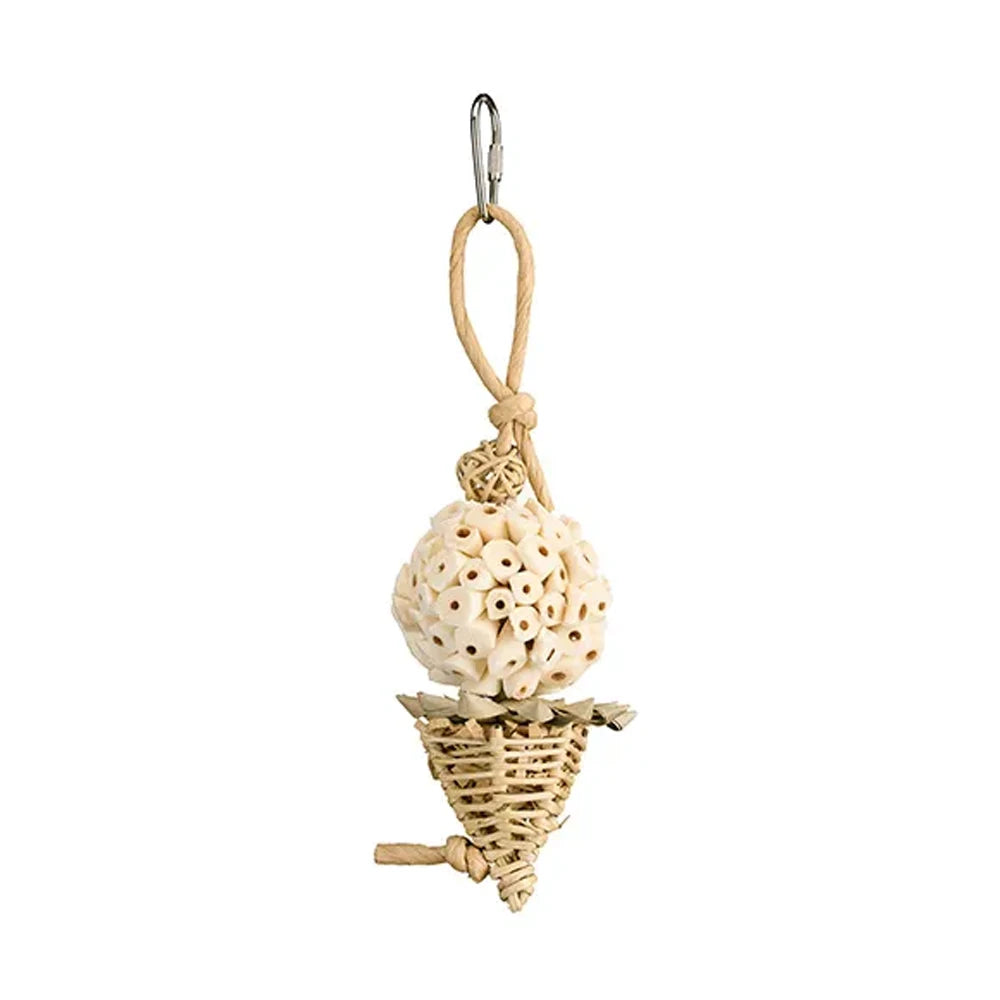 This charming toy features our ever-popular sola ball, known for its soft, bird-friendly texture, paired with a vine cone that’s stuffed with paper shreds and topped with a decorative pandan star. It’s a fun and satisfying outlet for birds who enjoy gentle chewing and foraging.