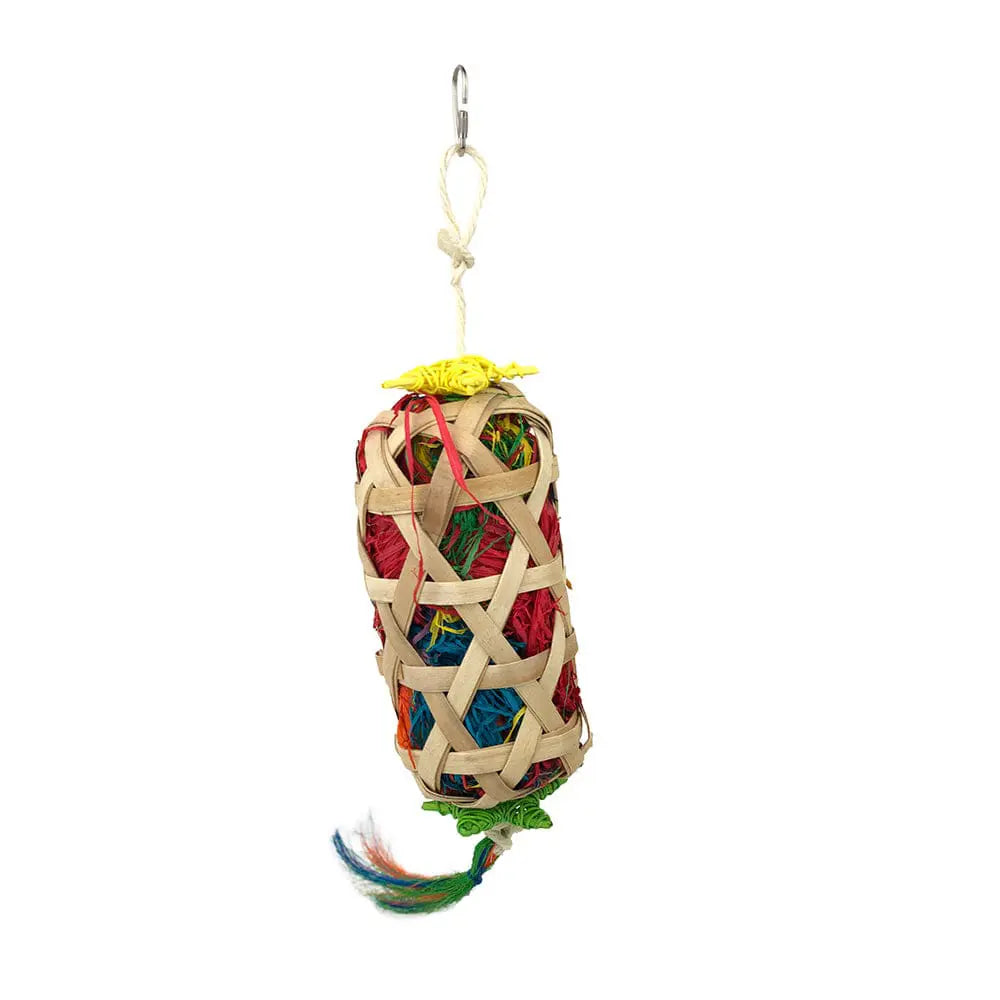 The Foraging Cylinder is made from hand woven palm leaf and filled with colourful shred and natural fibres. This toy will be sure to satisfy the natural foraging behaviours, chew and destroy nature of parrots!