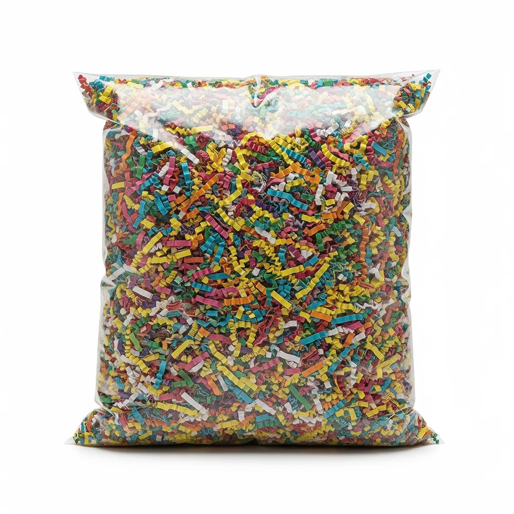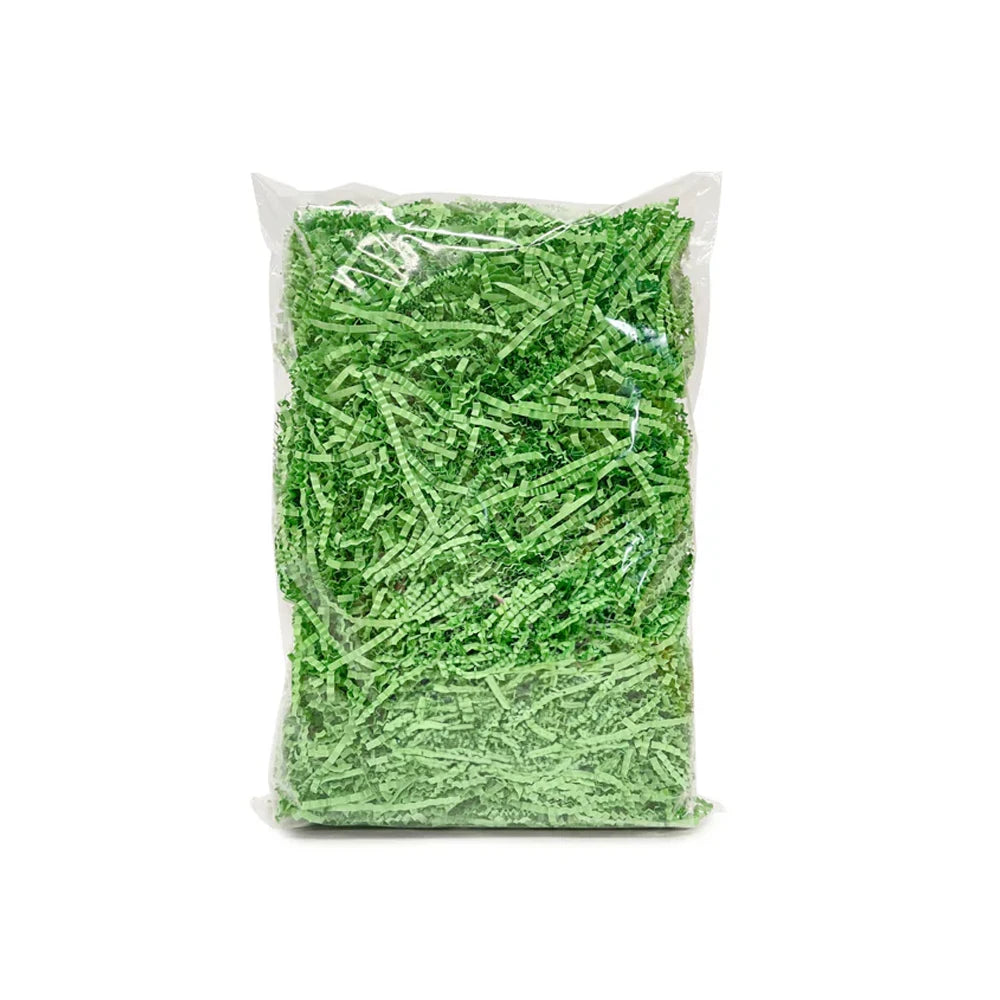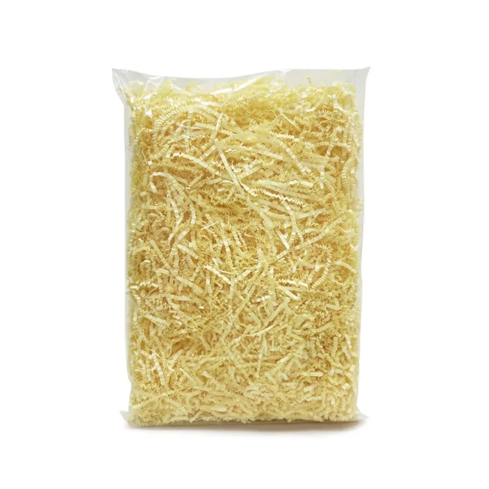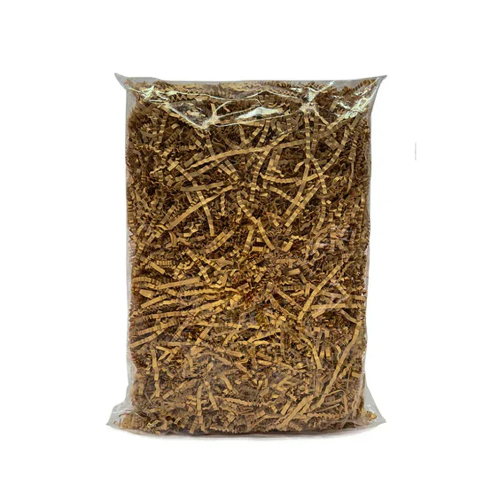 Photos show shreds slightly fluffed up. Our crinkle paper shreds are compacted for delivery and storage. Simply fluff back up to their original size when ready to use.