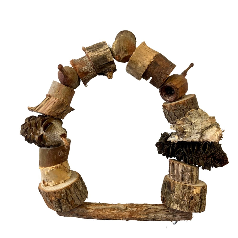 The Natural Swing Small is designed from a variety of Australian native offcuts and dried pods, featuring elements such as Eucalyptus, paper bark, tea tree, bottle brush, grevillea, and banksia. Gumnuts and banksia pods are also integrated into the toys, providing diverse shapes and textures for your feathered companion to chew on, ensuring an engaging experience.