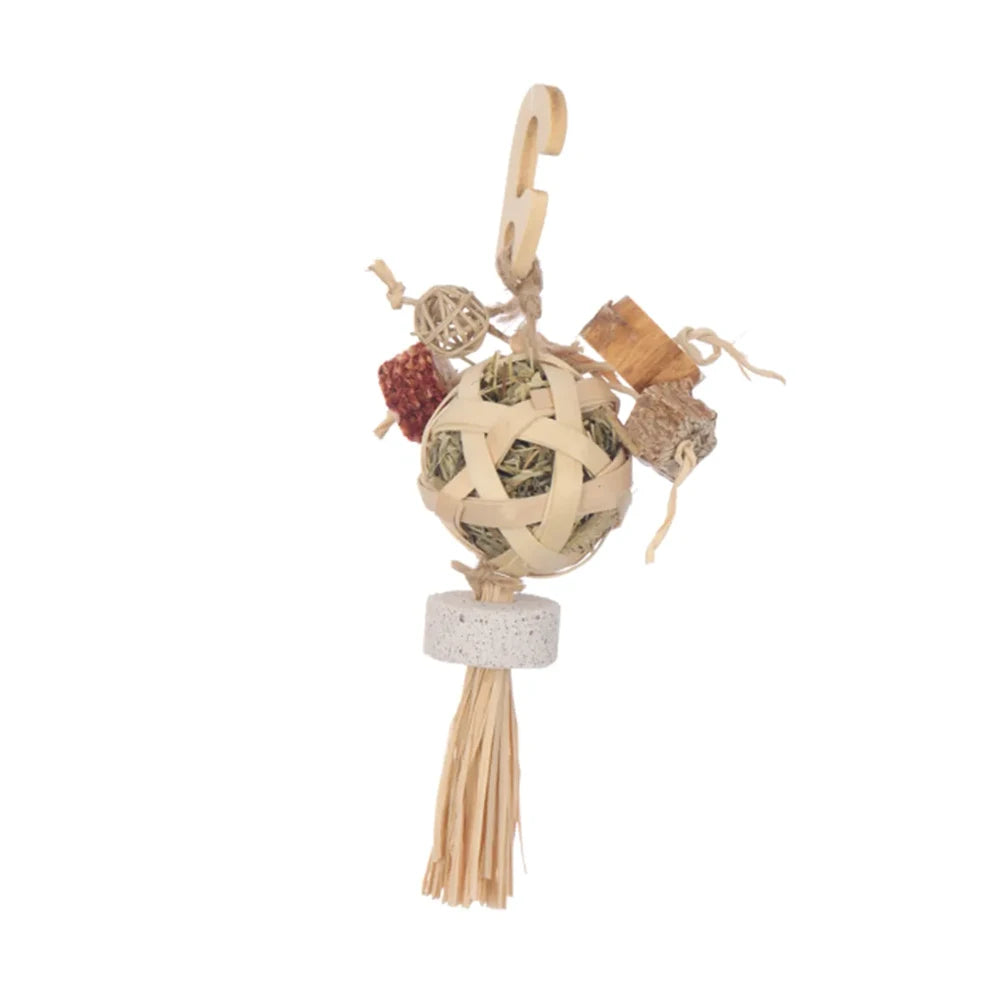 This eye-catching toy is packed with a variety of enriching, bird-safe materials: corn husk and cob, sunflower stalk slices, lava stone, mahogany slices, a vine ball, and a wicker ball stuffed with foraging grass. Held together with paper and jute twine and topped with a wooden hook, it's perfect for chewing, shredding and satisfying foraging instincts.