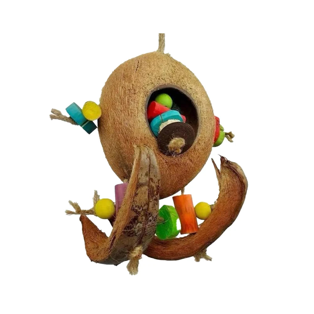 Just becaue I’m all nice and natural, does not mean parts of me aren’t tough. You can recycle / (re)create your own bird toy using my nickel plated chain and quick-link, and re-use- my java wood parts and coconut shell.