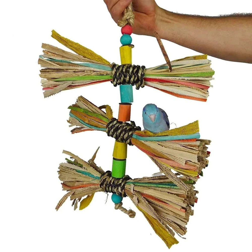 Nino's Java Mr Knots sets a challenge to untie its knots. Your feathered friend will need to concentrate because this toy can move around a lot. Use the colour (natural vegetable dye) and movement of Mr Knots to stimulate your bird with the physical and mental excercise they need. Hide treats amongst the pandan leaves to encourage your bird to engage and forage. Mr Knots can be used vertically or horizontally to provide a variety of challenges and interest.