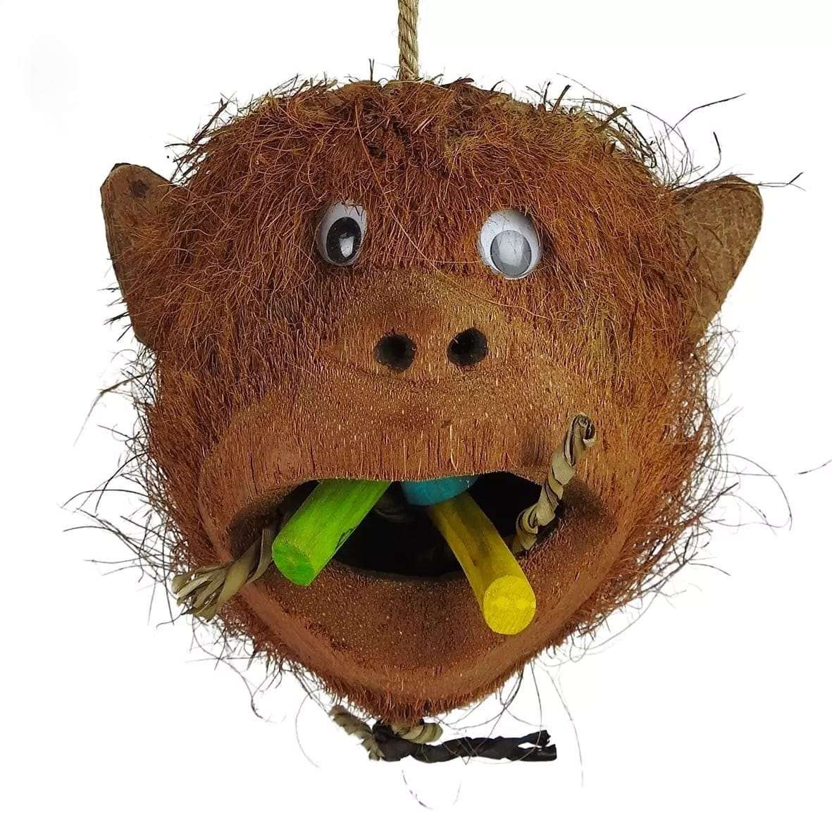 Entertain your pet with the cheeky Mr Monkey who chews with his mouth open! Create the stimulation your bird needs via foraging and exercise by hiding treats in his mouth or hanging them from the chain. Let “Birdy” rip at his coconut husk hair and play with the colourful (natural vegetable dye) java wood toys in his mouth. Recycle and re-use the nickel plated chin and quick-link to create another bird toy. Add more friends by pairing him up with Miss Monkey for double the fun.