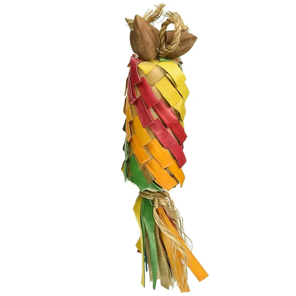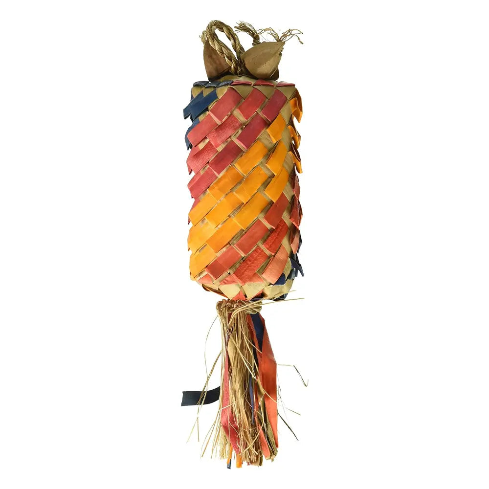 Satisfy your bird's desire to chew and destroy things with the Planet Pleasures Rainbow Pinata Diagonal. It's two toys in one! Crunchy, hand-woven palm leaf on the outside and natural fibres and shredders tied to a rope on the inside. Birds will spend countless hours chewing through the outside, just to find a surprising amount of chewing pleasure waiting for them on the inside.