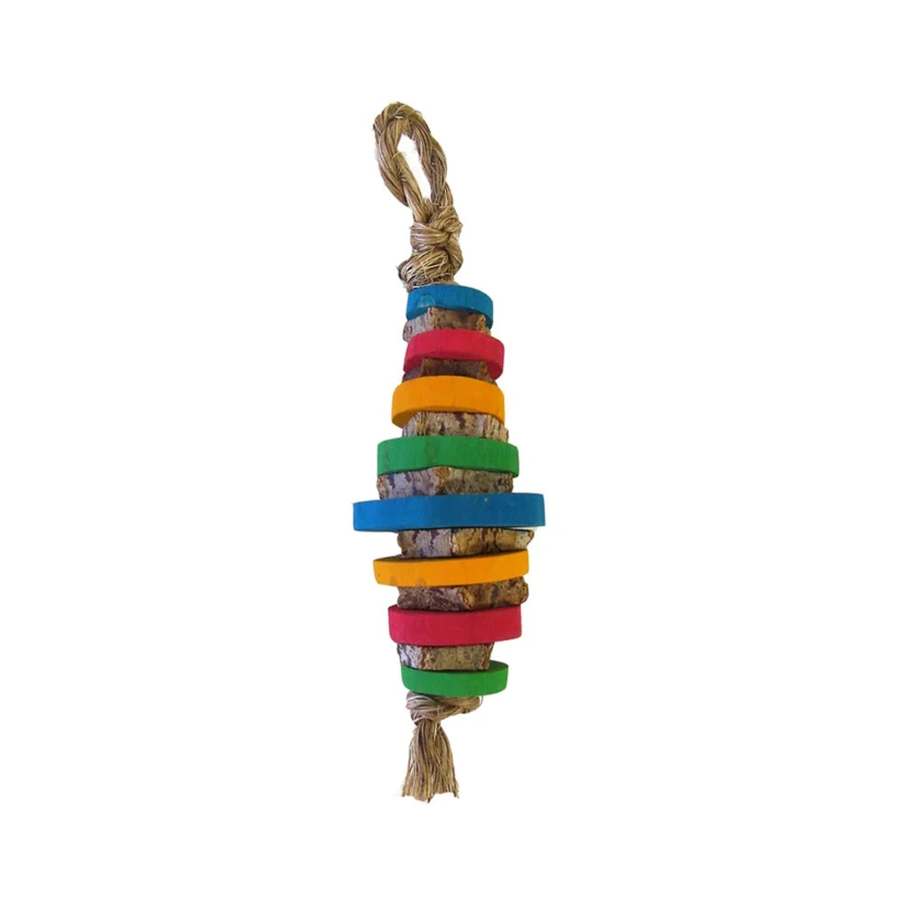The Planet Pleasures Rugby hanging toy is made from Mahogany slices sandwiched between Java wood. Suitable for Small birds as a hanging toy or a foot toy for the Medium to Large birds.