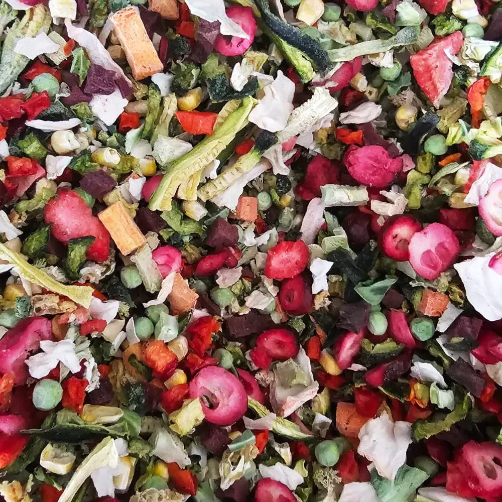 Introducing Mighty Bird Premium Freeze-Dried Bird Chop - Fruit & Veggie Blend. The perfect blend of freeze-dried fruits and vegetables for birds. Specially blended for parrots, parakeets, cockatiels, conures, and all companion birds, this nutritious medley delivers vibrant colour, fresh taste, and essential nutrients in every bite. Our unique freeze-drying process locks in vitamins and minerals — with no added sugars, fillers, or preservatives.