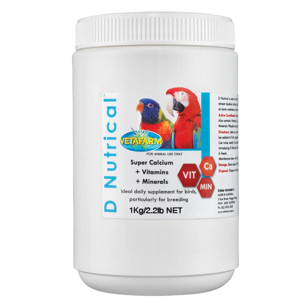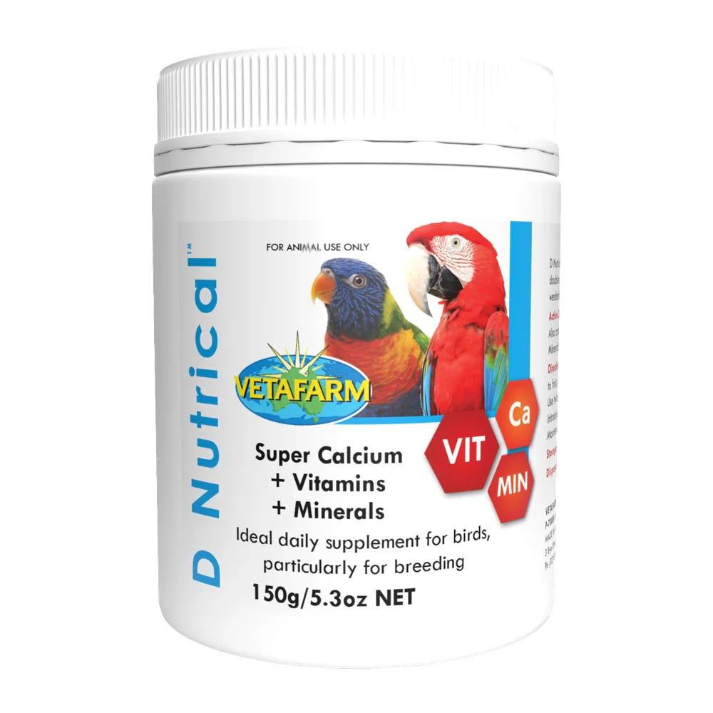 Contains vitamins, minerals and calcium. Supports birds on seed diets that lack in key nutrients. Particularly useful for calcium supplementation in breeding birds and growing chicks. Triple calcium sources promote high quality eggshell production, strong bone formation in young birds and general good health. Easily dusted onto food sources. Ideal supplement to fortify homemade hand rearing formulas.