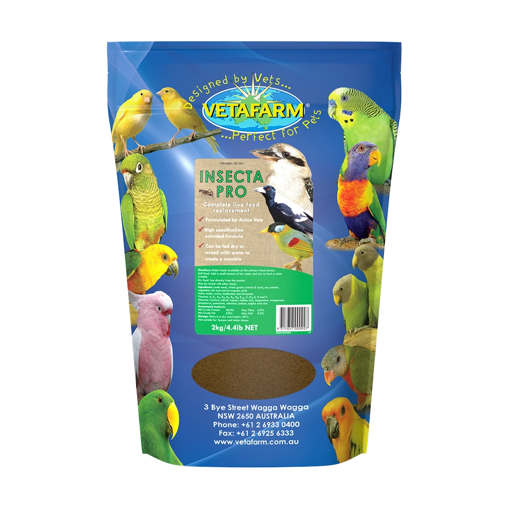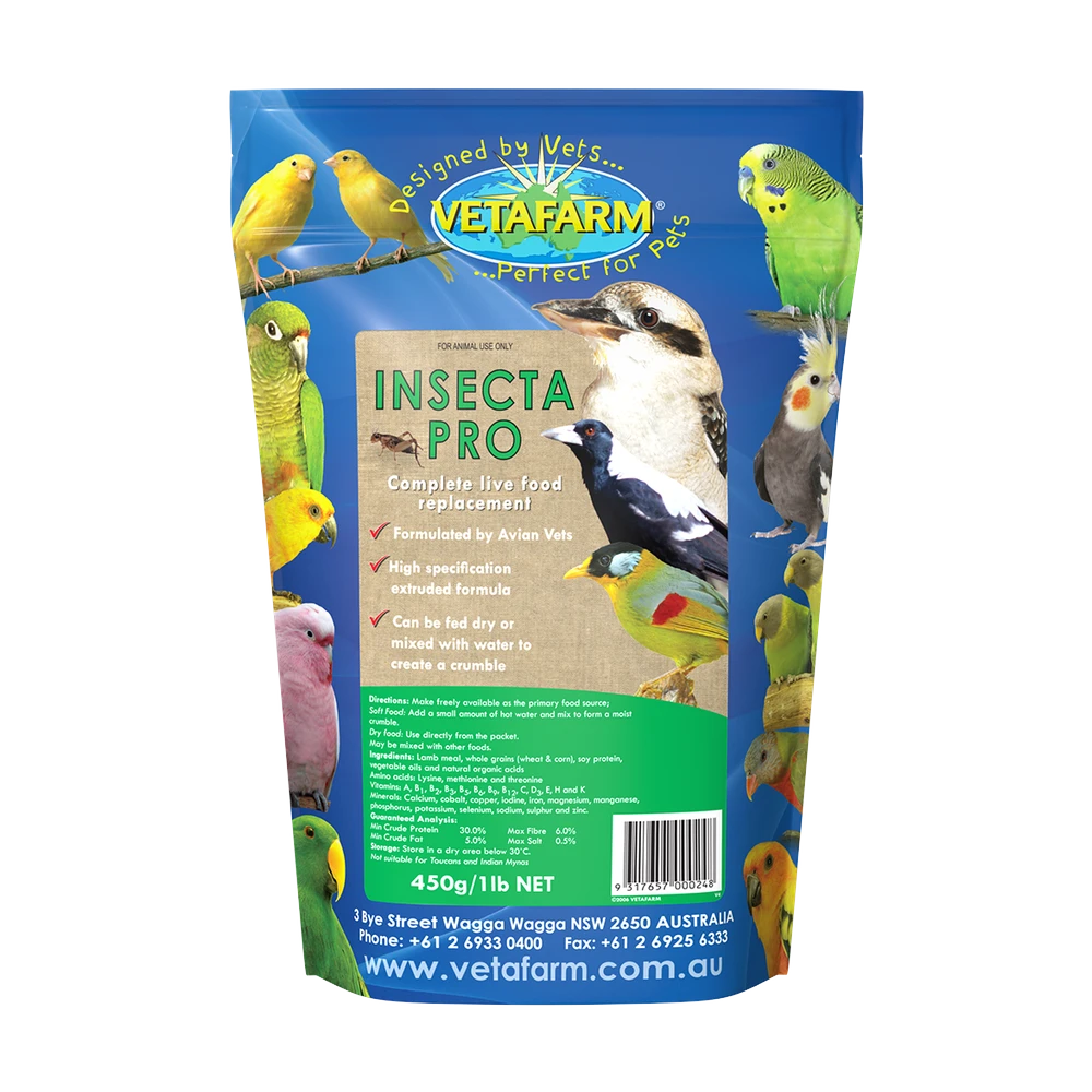 Insectivorous birds require a diet high in fat and protein. Insecta Pro has been formulated by Avian Veterinarians to provide a supplemental feed for all insectivorous birds, including those requiring "live food". This product is extrusion cooked for safety and digestibility, and can be fed dry or mixed with water to create a crumble.