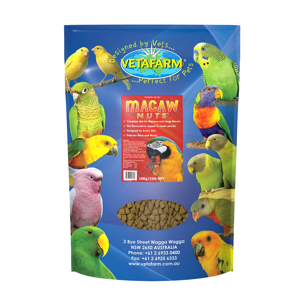 Macaw Nuts were designed by avian veterinarians as a species specific formula designed for South American parrots, containing all the necessary nutrition for general maintenance, as well as increased fatty acids, protein, vitamins and calcium to support egg production, young bird growth and general breeding.