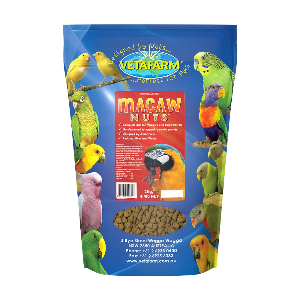 Macaw nuts have been developed to provide complete nutritional balance for growth, breeding, brain function and optimum feather development when fed at 80% of the total diet. The remaining 20% should consist of a combination of fresh fruits and vegetables (15%) and fresh hand selected nuts (5%) such as almonds, walnuts and macadamias, Vetafarm Deli-stix can also be added to this 5% as a healthy, balanced treat and behavioural enrichment tool.