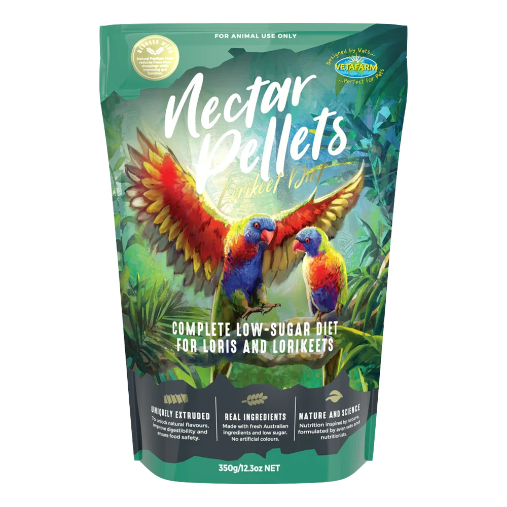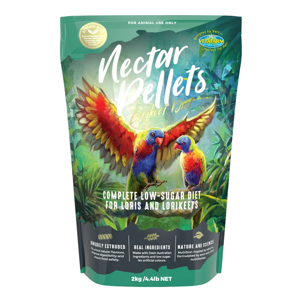 Nectar pellets were formulated by Avian Veterinarians to provide complete nutritional balance for growth, breeding, brain function and optimum feather development for all Loris and Lorikeets, when fed as 80% of your birds total diet. The remaining 20% should consist of a combination of fresh fruit and vegetables (15%) and treats such as nectar mixes (5%). Vetafarm Best of Both Worlds Deli Stix can be added into this 5% as a treat and behavioural enrichment tool. This product is made with fresh Australian ingredients, is a low sugar diet and does not contain any artificial colours.