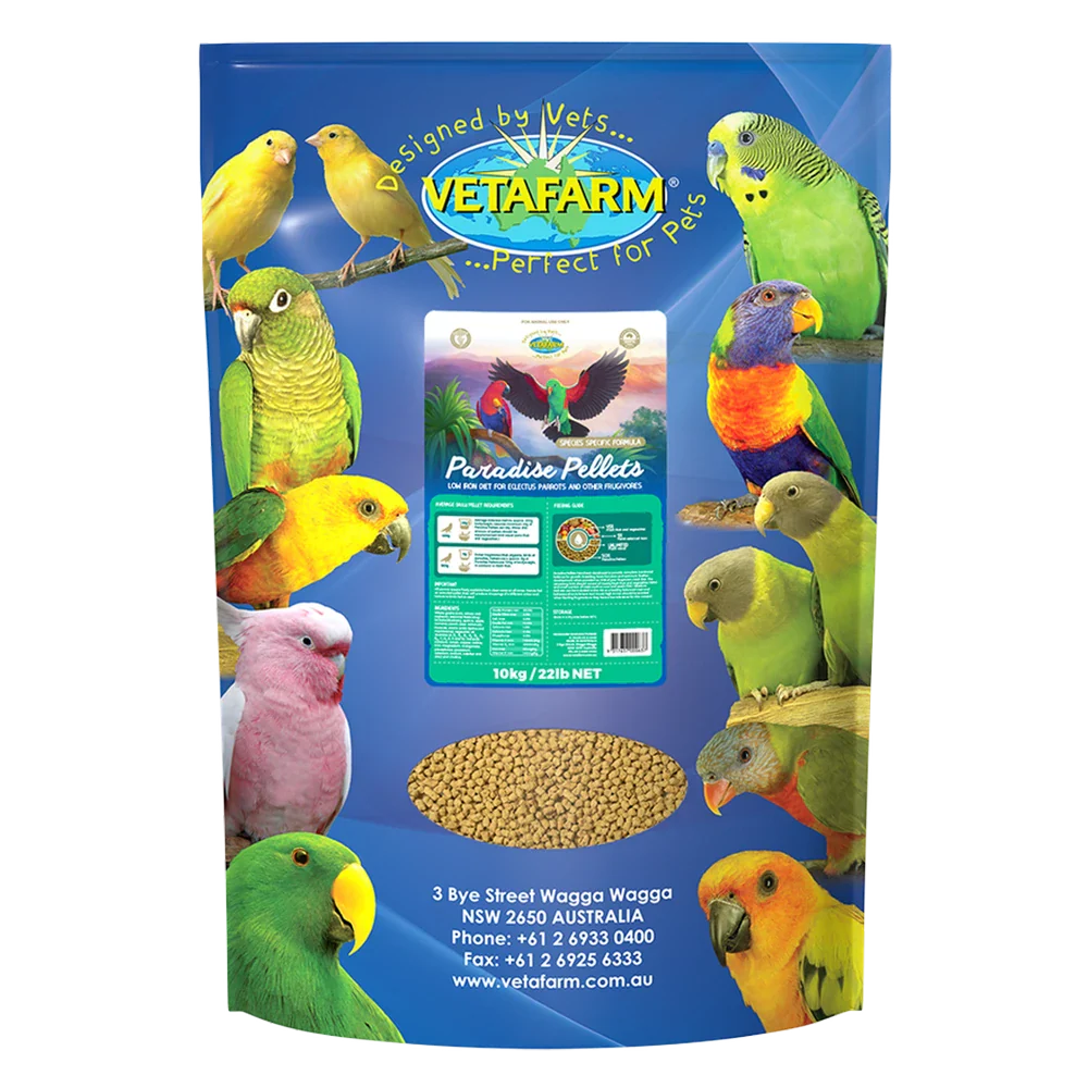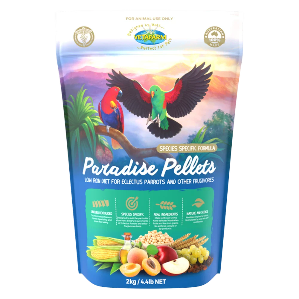 Paradise Pellets were formulated by avian veterinarians as a species specific formula to suit the low iron dietary requirements of Eclectus Parrots and other frugivorous birds. The basis of any diet for birds should come from the most reliable source - nature. This inspiration was used to create this completley balanced diet based on fresh fruit and select low iron grains from Australian farms.