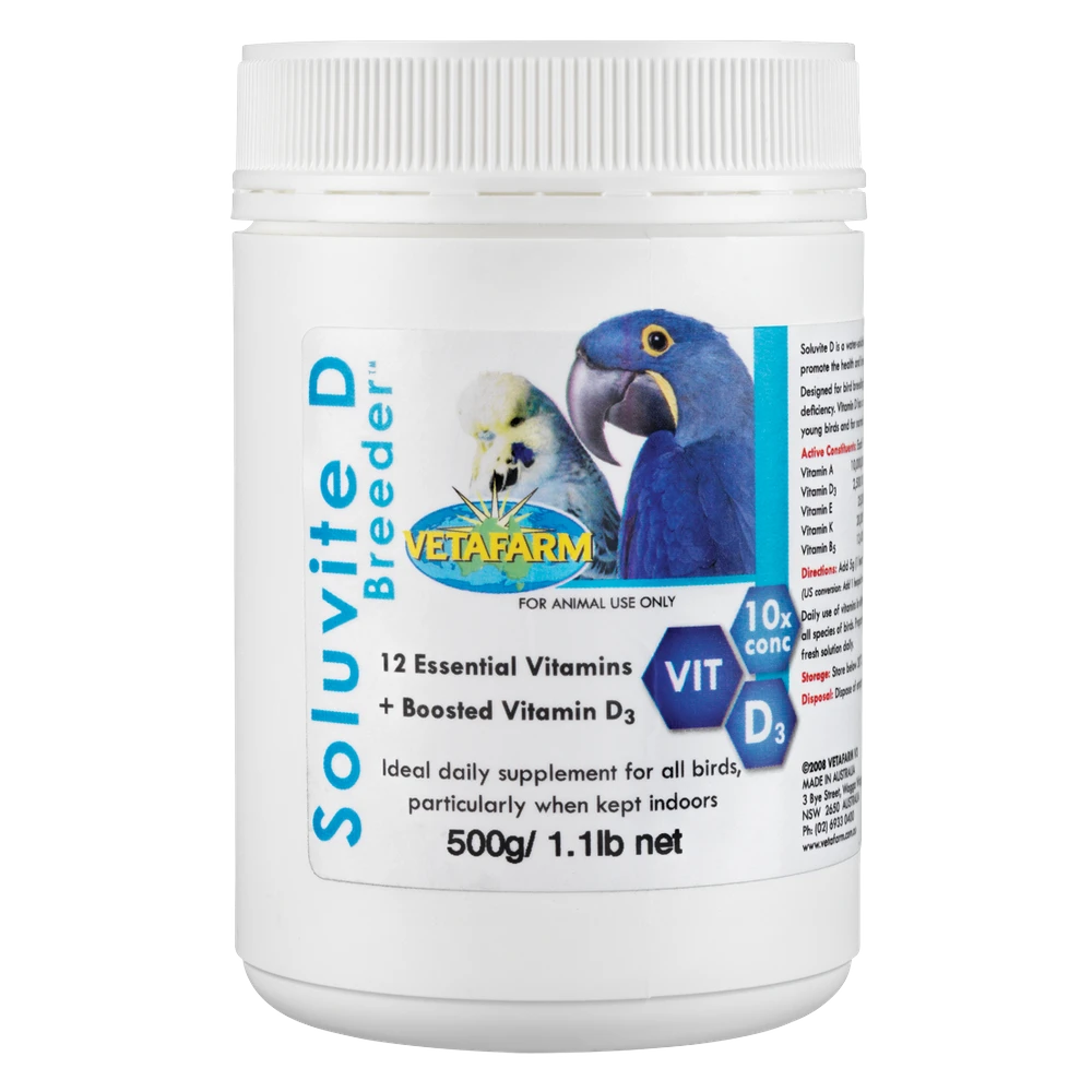 Soluvite D is a water-soluble formula that provides additional Vitamin D3, as well as 12 essential vitamins and minerals to promote the health and breeding performance of birds housed indoors. Designed for bird breeding farms, zoos, and indoor aviaries. Limited exposure to sunlight may result in Vitamin D deficiency. Vitamin D has a role in the absorption of Calcium. Calcium is essential for normal growth of healthy bones in young birds and for normal eggshell formation in breeding hens.